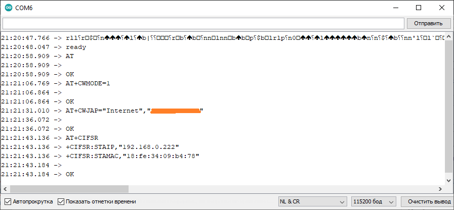 AT+CIFSR – modulning IP-manzili va MAC-manzilini ko’rish. Oxirida “OK” yozuvi qaytarilishi kerak.