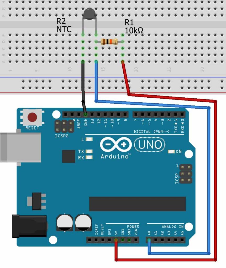 Navbatdagi misolda analog datchiklar bo’yicha darsda ko’rib chiqilgan, termistor asosidagi termometrni GyverNTC nomli maxsus bibliotekani qo’llagan holda qayta yaratilgan. Buning uchun bibliotekani yuklab olamiz. Termistor asosidagi termometrning ushbu variantida bibliotekadan foydalanish hisobiga sketch sewzilarli darajada soddalashganini ko’rishimiz mumkin.