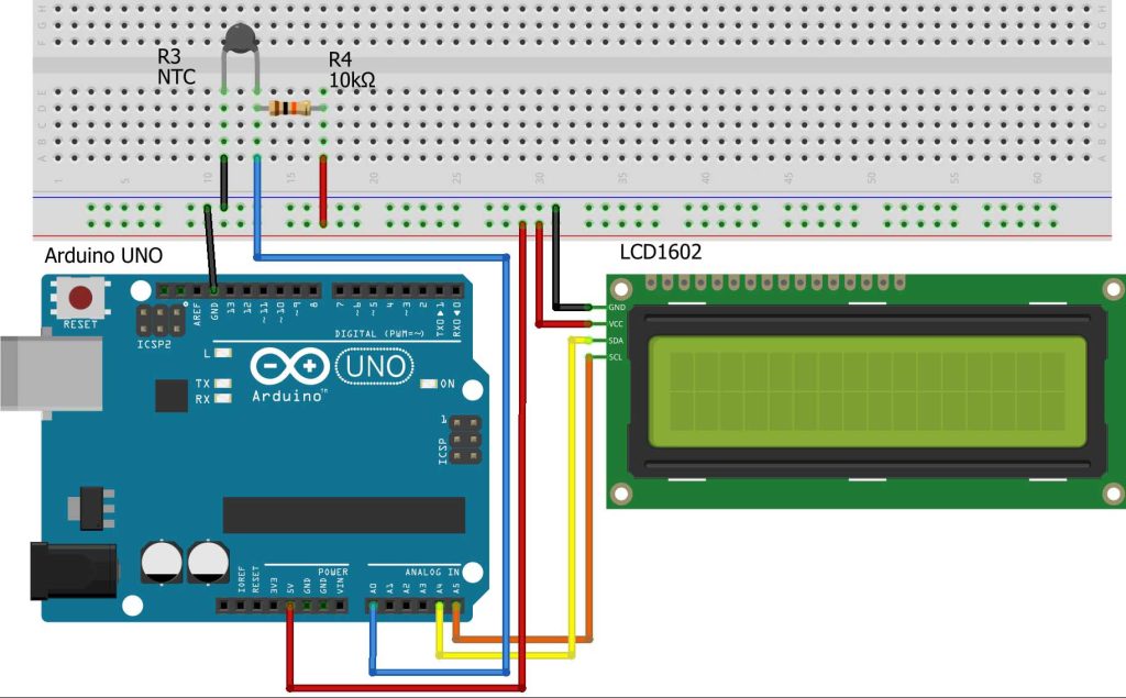 Endi yuqoridagi termometr loyihasiga LCD1602 displeyini qo’shish orqali, harorat ko’rsatkichlarini nafaqat ketma-ket port, balki displey orqali ham kuzatishimiz mumkin bo’ladi. Ya’ni, yaratadigan sketchimiz yordamida to’laqonli termometr qurilmasini hosil qilishimiz mumkin. Buning uchun qurilma uchun tashqi korpus o’ylab topish talab etiladi xolos. Sketchga esa, LiquidCrystal_I2C bibliotekasini ulaymiz. LCD1602 displeyi va undan foydalanish bo’yicha, alohida dars orqali batafsil ma’lumotga ega bo’lish mumkin.