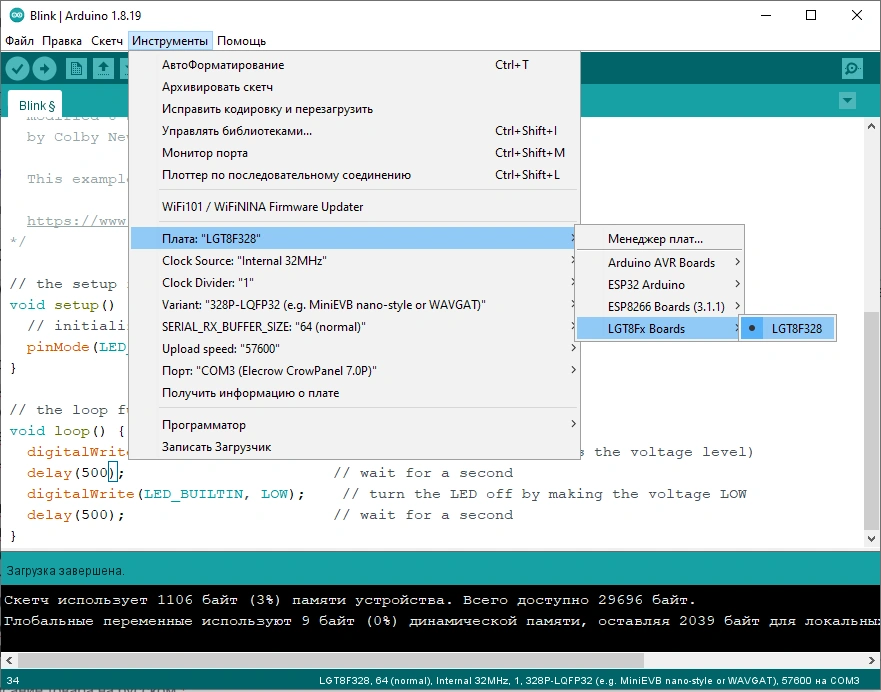 Xuddi shuningdek, Arduino IDE ni ESP32 (LGT8F328P) oilasi plata va modullariga ham moslashtirish uchun, “Файл” menyusining “Настройки” bo’limida “Дополнительные ссылки для Менеджера плат” matn maydoniga “https://raw.githubusercontent.com/espressif/arduino-esp32/gh-pages/package_esp32_index.json” (https://raw.githubusercontent.com/dbuezas/lgt8fx/master/package_lgt8fx_index.json) havolasi kiritilib, “Инструменты/Плата/Менеджер плат” bo’limida “ESP32” (“LGT8fx boards”) elementi va plata drayveri oxirgi versiyasi tanlanib, o’rnatiladi. O’rnatish yakunlangandan keyin “Инструменты” menyusidagi “ESP32 Arduino” (“LGT8Fx boards”) bo’limida yangi plata nomlari paydo bo’ladi.