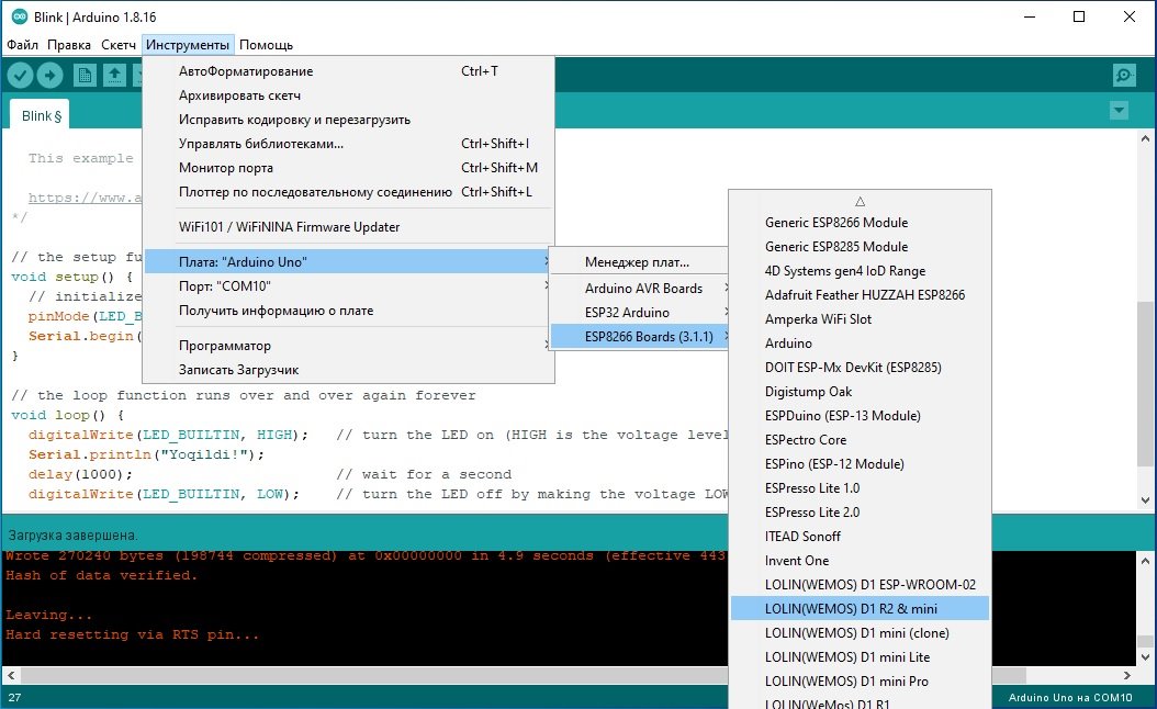 Masalan, ESP8266 oilasi plata va modullari (Wemos D1 mini, ESP-01, ESP-12 va hokazolar) uchun “https://arduino.esp8266.com/stable/package_esp8266com_index.json” havolasini kiritib qo’yish, shundan keyin “Инструменты/Плата/Менеджер плат” bo’limida “esp8266 by ESP8266 Community” elementi va plata drayveri versiyasi tanlanib, uni o’rnatish (“Установка” tugmasi bosiladi) zarur. O’rnatish yakunlangandan keyin “Инструменты” menyusidagi “ESP8266 boards” bo’limida yangi plata nomlari paydo bo’ladi (Arduino standart platalari ro’yxati esa “Arduino AVR board” bo’limida ko’rinadi). ESP8266 oilasining notanish plata yoki moduli bilan ishlashga to’g’ri kelsa, ko’pincha “Generic ESP8266 module”ni tanlash yetarli bo’ladi.