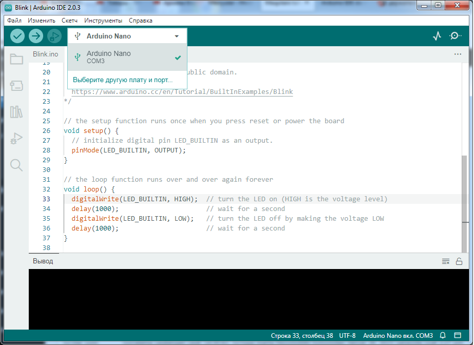 “Файл” menyusi “Примеры/01.Basics” bo’limidan “Blink” sketchini tanlaymiz. Oynada sketchning quyidagi kodi ochiladi (Uni plataga yuklashdan oldin Arduino platasini kompyuter USB portiga ulaymiz va menyudan kerakli plata hamda portni ham tanlaymiz):