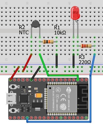7-misol. Ushbu variantda ESP32 platasidagi ichki Bluetooth modulining BLE rejimidan foydalangan holda plataga ulangan termistor ko’rsatkichlarini smartfonga yuborish va unga ulangan svetodiodni universal mobil ilova yordamida boshqarish, shuningdek, ESP32 modulidan “mayoq” sifatida foydalanish, maxsus mobil ilova yordamida esa, BLE rejimida ishlaydigan shu va boshqa “mayoq”larni izlash, ularning signali quvvatini aniqlash, ulargacha bo’lgan taxminiy masofani aniqlash jarayonlarini ko’rib chiqamiz.