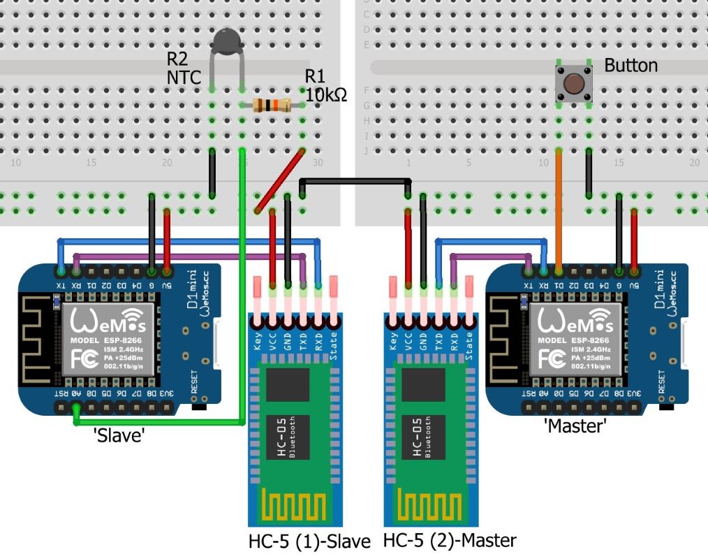 Boshqaruvchi (“Master”, boshqaruv pulti) va Ijrochi (“Slave”, boshqarish obyekti) vazifasini Wemos D1 mini platalari bajaradi. Ma’lumki, Bluetooth orqali bog’lanish uchun modullardan biri mijoz, ikkinchisi server vazifasini bajarishi kerak (mijoz rolidagi modul server rolidagi modulga bog’lanadi, aksincha tartibda bog’lanib bo’lmaydi). Lekin, bog’lanish amalga oshirilganidan keyin, platalarning har ikkisi ham ma’lumot yuborishi yoki qabul qilishi mumkin bo’ladi.