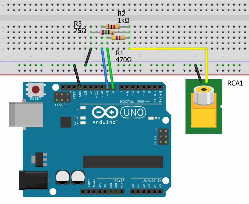 Yuqorida biz ma’lumotni faqat tayyor indikator yoki modullarga chiqarish variantlarini ko’rib chiqdik. Endi Arduino yordamida ma’lumotni televizor ekraniga chiqarish variantini ko’rib chiqamiz. Bunda dastlab Arduino va televizor signallarini o’zaro moslashtirib beruvchi kichik konverterni quyidagi sxema asosida tayyorlab olishimiz kerak bo’ladi: